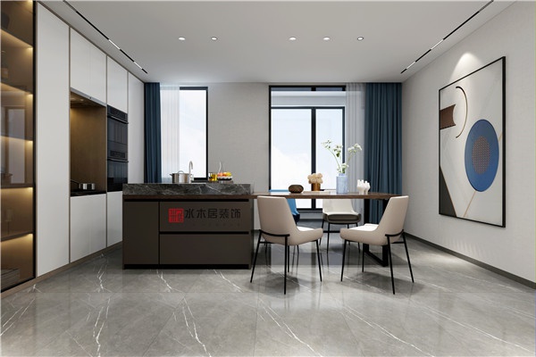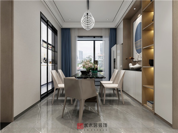 餐廳:餐廳的設(shè)計(jì)給人柔和優(yōu)雅的氣質(zhì)。原木色柜體與巖板餐桌的材質(zhì)顏色的對(duì)比,既有木的溫潤(rùn),也有巖板的剛硬,一剛一柔,一深一淺,勾勒出空間的張力和層次。
